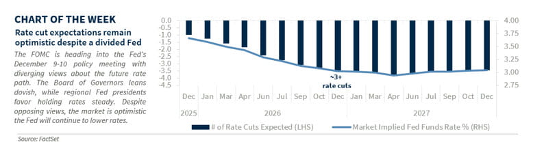 • Fixed Income: Next week’s expected 25 basis point “hawkish cut” should keep the Treasury yield curve’s recent steepening bias intact. Continued Fed easing will likely anchor short-term yields (up to 2 years), while longer maturities—10-year and beyond—drift higher as growth prospects improve and inflation stays sticky. The odds of the 10-year Treasury yield falling sustainably below 4% remain low outside a recession—a scenario we view as unlikely. The bigger risk? If the incoming Fed chair signals a deeper rate-cutting cycle than fundamentals justify, inflation expectations could quickly become unanchored as the economy runs “hot,” pushing long-term yields even higher. To do this, Hassett would need to build consensus at the FOMC, not an easy task given current divisions on the FOMC.